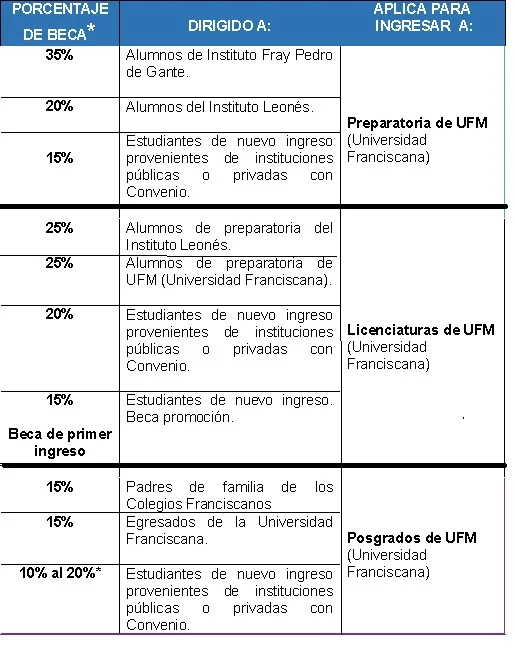 Como parte de nuestro compromiso con la formaci贸n integral, el Programa de Becas brinda apoyo especial a alumnos y familias provenientes de los Colegios Franciscanos (Fray Pedro y Gante, Instituto Leon茅s y Universidad Franciscana de Le贸n), facilitando el acceso a la educaci贸n continua con importantes beneficios acad茅micos y econ贸micos.